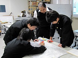 山口県立宇部高等学校の高校生3名が、体験配属(11回目・最終回)で来室しました。SSH Ⅱ 体験配属最終回の今日は、最初に瀧本准教授から山口県内の活断層や地震について講義を受けた後、工学部キャンパス周辺の地図を用いた図上訓練(DIG)を行いました。また、体験配属終了後、SSH Ⅱ の閉講式が行われ、いよいよ来年度は最終段階のSSH Ⅲ へと突入します。(写真:図上訓練(DIG)を行う高校生)